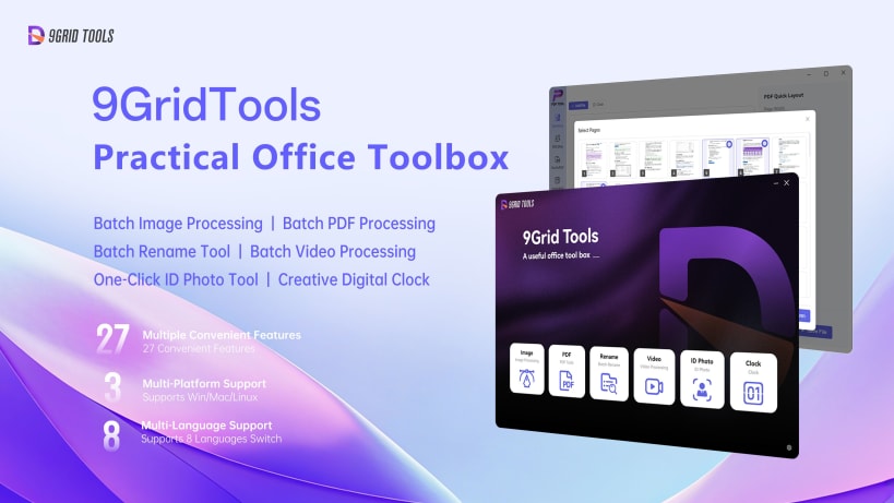 9GridTools办公工具箱软件,好用的办公工具箱,拥有27项便捷功能。 包含图片批量处理、PDF批量处理、批量重命名、视频批量处理、证件照一键制作、创意数字时钟等实用工具。 支持图片裁剪/拼图/旋转/尺寸修改、图片/文档/PDF格式转换、PDF排序、PDF合并拆分、图片PDF压缩、PDF加密解密、水印添加、一键抠图、视频合并分离/抽帧等众多功能。 软件支持暗黑主题、自定义首页壁纸、8种多语言等功能。 27项便捷功能 | 多平台支持 | 多语言支持8种语言一键切换