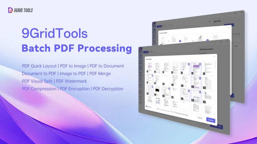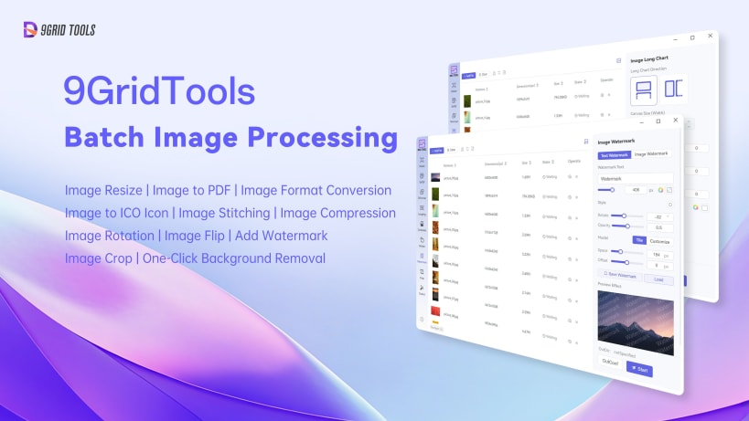 9GridTools es una aplicación de escritorio completa que ofrece herramientas potentes para : Operaciones PDF : fusionar, dividir, comprimir, agregar marca de agua, protección con contraseña Procesamiento de imágenes : comprimir, redimensionar, conversión de formato, agregar marca de agua, recortar Edición de vídeo : cortar, fusionar, conversión de formato, agregar marca de agua, extraer fotogramas Conversión de documentos : Office a PDF, PDF a imágenes Y muchas otras funciones útiles para el procesamiento diario de documentos y medios.