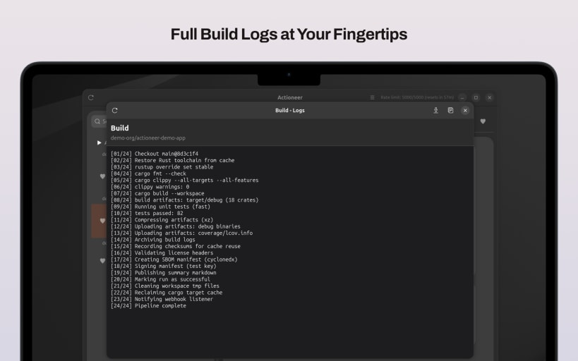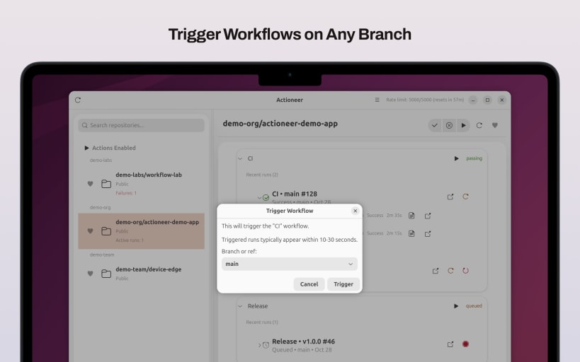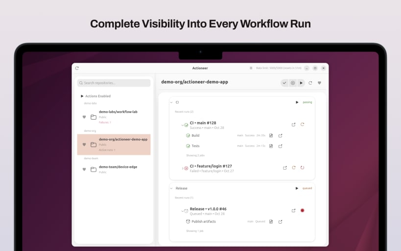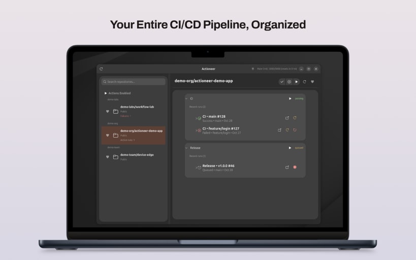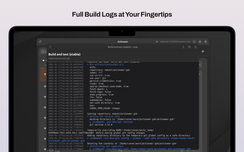 Actioneer is a native GTK4/libadwaita application that lets you browse GitHub repositories, inspect workflow runs, check job logs, and trigger background refreshes without leaving your desktop and integrates with GNOME notifications.