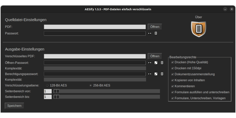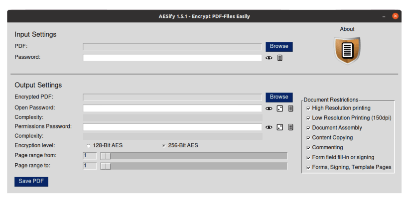 With AESify you can encrypt PDF files with "military grade" Advanced Encryption Standard (AES) encryption, set "Document open" and "Permissions" passwords, set document restrictions and define a page range if you want to export a part of your PDF. If you want to access removable (mounted) media/drives do not forget to allow read/write access in AESify's snap store permission settings!
