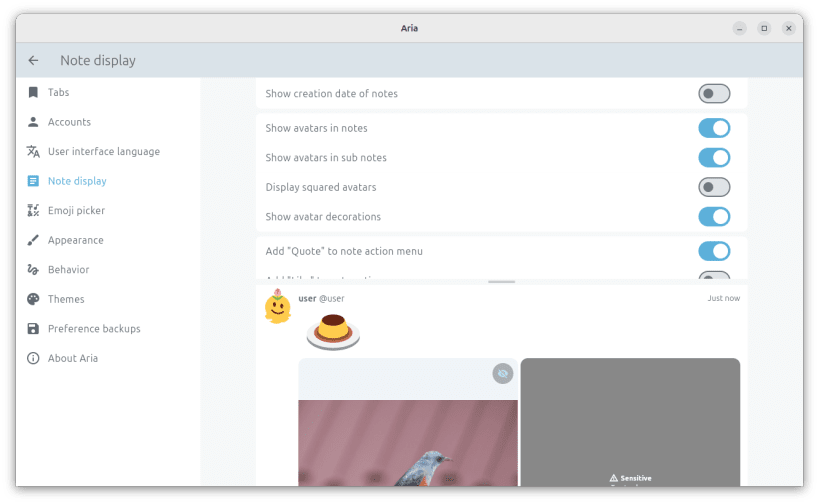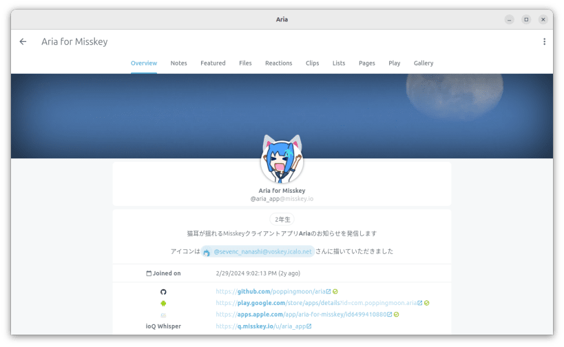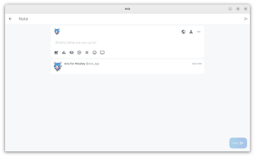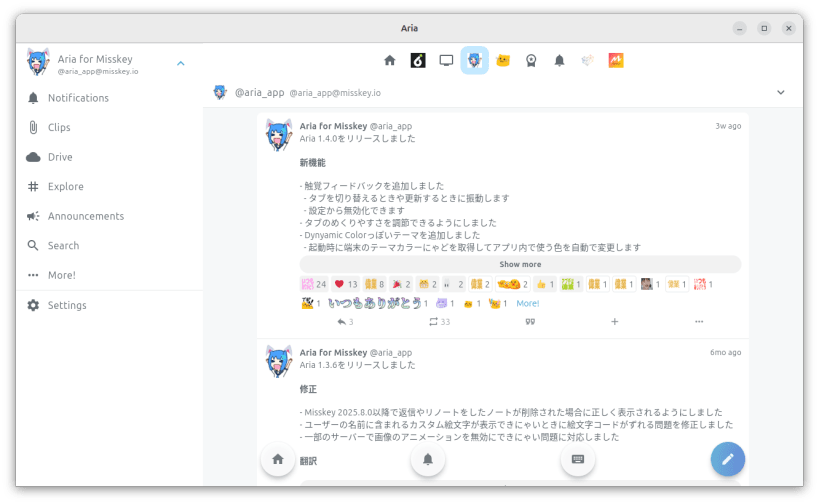Aria supports most of the functions available in Misskey, including viewing various types of timelines, posting notes, editing clips, lists or antennas, etc.