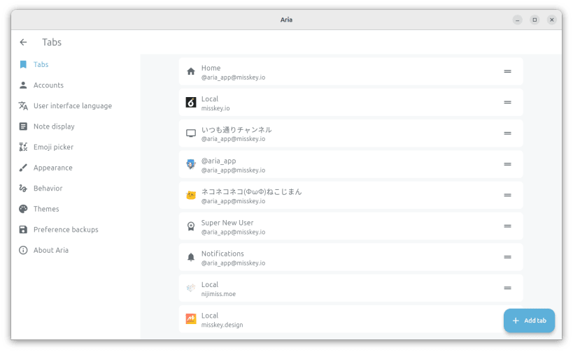 Aria makes it easy to view different timelines by saving the timelines you want to view as tabs. Adding any account's timeline to a tab makes it easy to follow topics across servers.