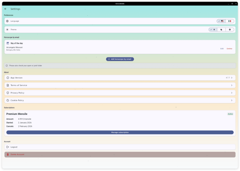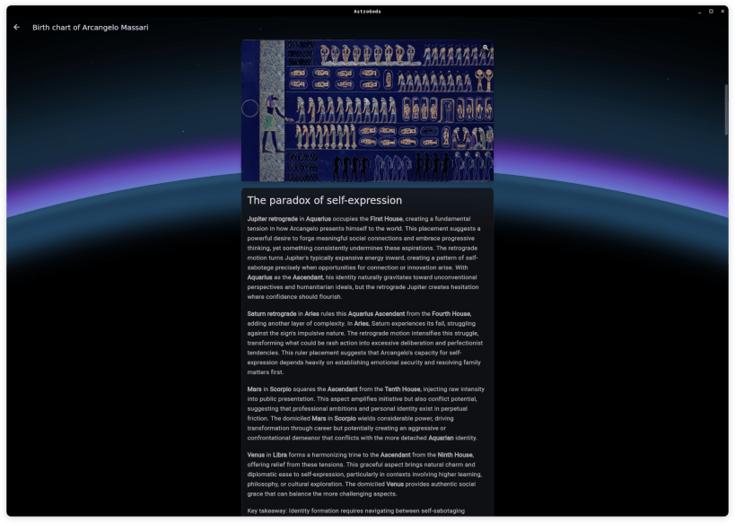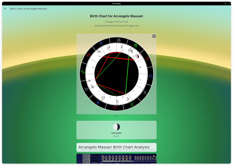 AstroGods starts from the position of the planets at the moment of your birth to offer you a portrait of who you are: your way of loving, thinking, acting. You can explore compatibility with another person or understand what energies characterize a period of your life.