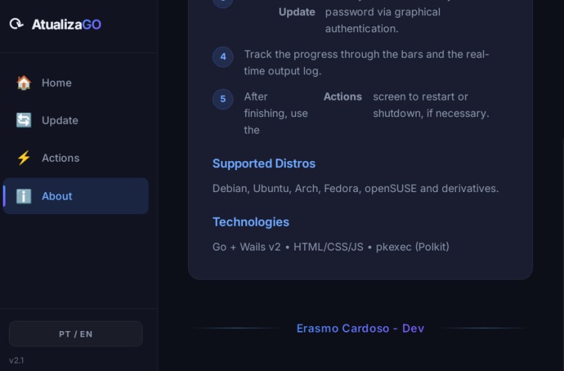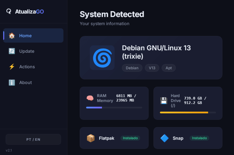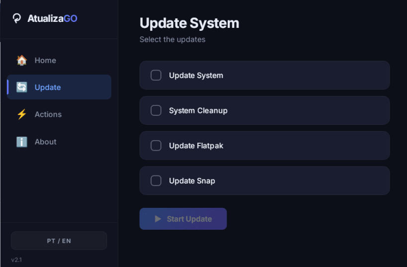 Atualiza GO is a lightweight graphical tool to update and maintain Linux systems without using the terminal.