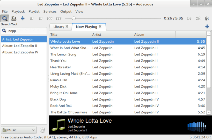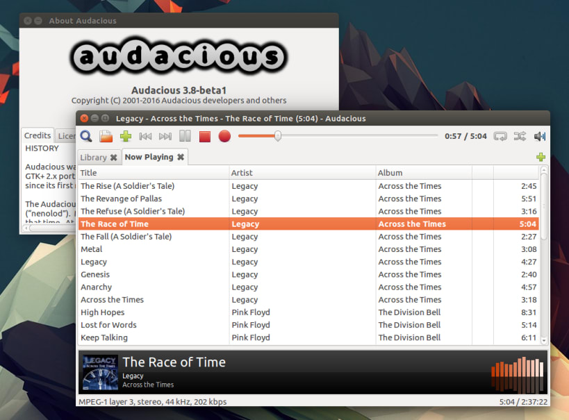 Drag and drop folders and individual song files, search for artists and albums in your entire music library, or create and edit your own custom playlists. Listen to CD’s or stream music from the Internet. Tweak the sound with the graphical equalizer or change the dynamic range with audio effects. Enjoy the modern Gtk-3 themed interface or change things up with Winamp Classic skins. Use the plugins included with Audacious to fetch lyrics for your music, display a VU meter, and more.
