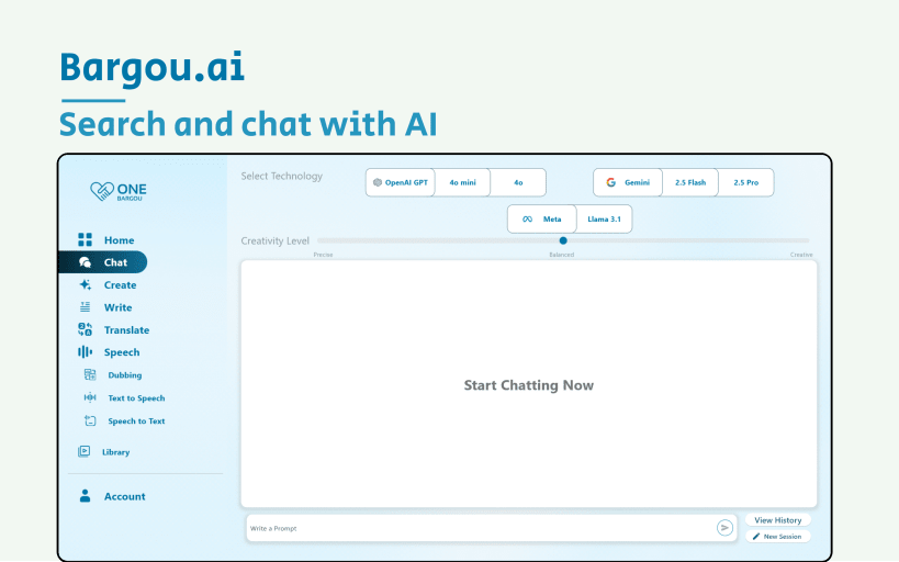 Search for information and chat with different AI LLMs. You can adjust the creativity level of the AI and view previous conversations.