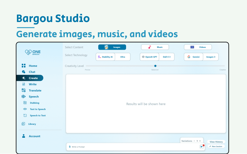 Generate images, music, and videos using the OpenAI DALL-E, Google Gemini, Stability AI, and Meta Music Gen technologies. Bargou Studio generates up to 6 variations of your prompt.
