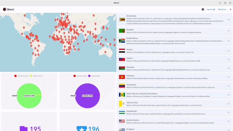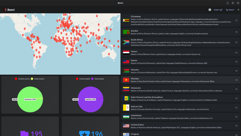 Keep track of places in the World that you have visited. The app visualizes the visited countries, districts and cities as a list and as a world map and allows to export and import markers.