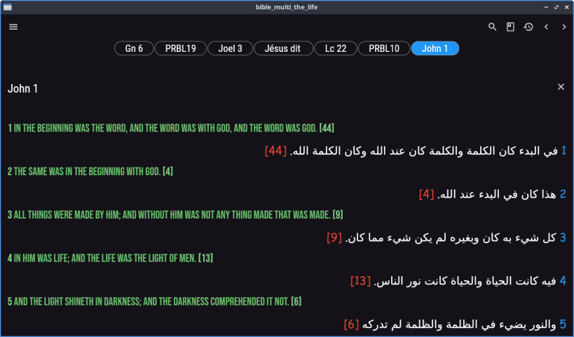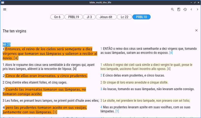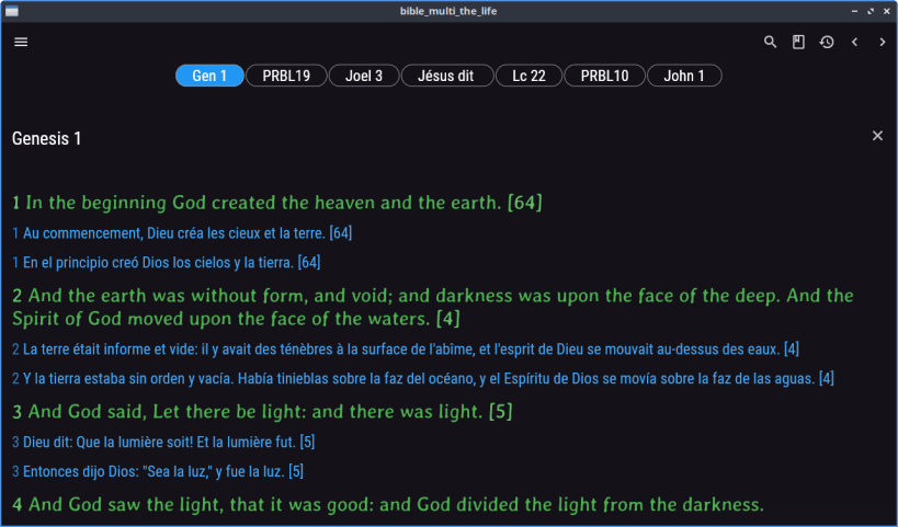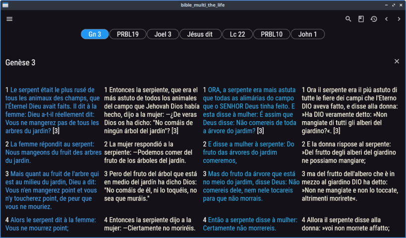 Bible multi languages, free, offline, no advertising, in English, French, Italian, Spanish, Portuguese.