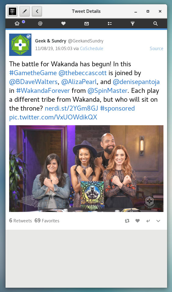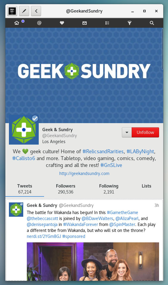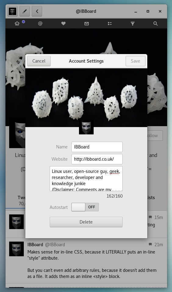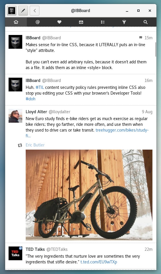 Cawbird is a modern and lightweight Twitter client for the GNOME 3 desktop. It features inline image and video preview, creation of lists and favorites, filtering of tweets and full text search. Cawbird is able to manage multiple Twitter accounts.