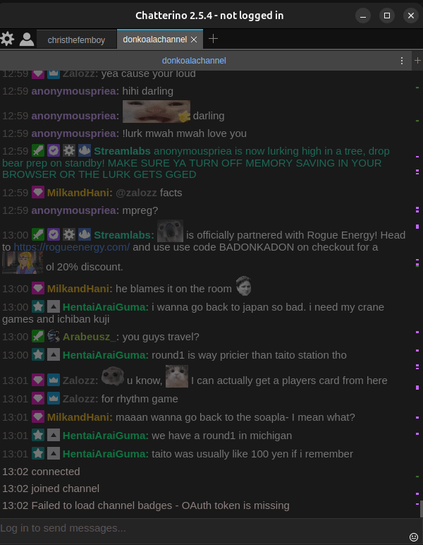 Chatterino is a chat client for Twitch chat. It aims to be an improved/extended version of the Twitch web chat.