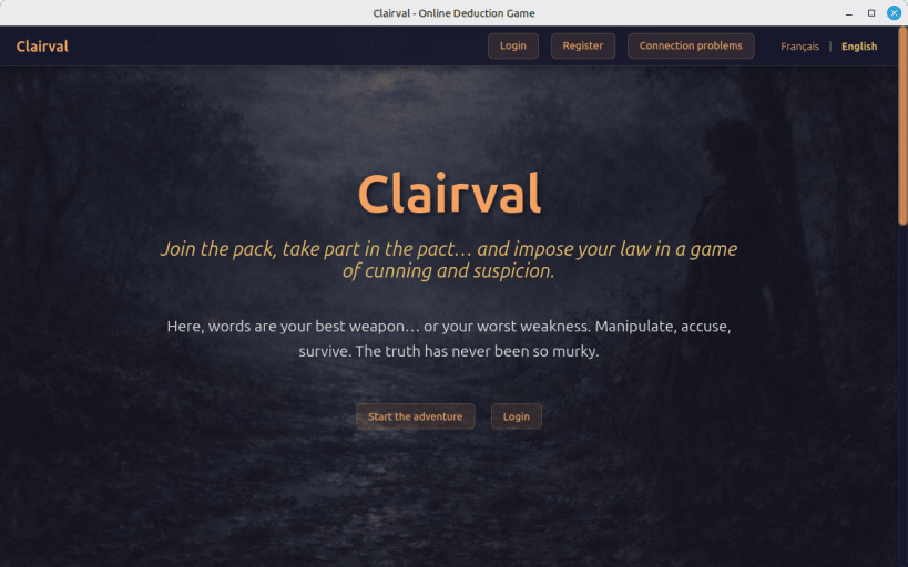 Dive into a world where cunning and strategy are your greatest weapons. Clairval is an online deduction game inspired by the famous Werewolves of Thiercelieux. Join the pack, take part in the pact… and impose your rule in a game of deception and suspicion.