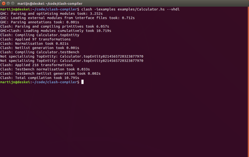 Clash is a functional hardware description language that borrows both its syntax and semantics from the functional programming language Haskell. The Clash compiler transforms these high-level descriptions to low-level synthesizable VHDL, Verilog, or SystemVerilog.