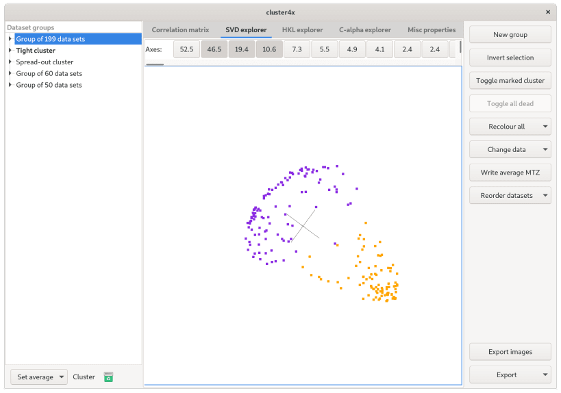 Cluster4x is an interactive GUI allowing you to cluster and analyse your collected multidatasets and better understand your system by reciprocal lattice intensities or real space C-alpha positions.
