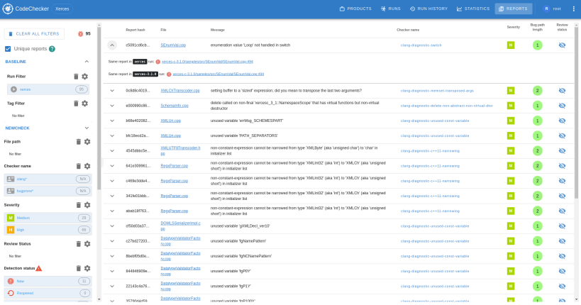 - Filterable (defect checker name, severity, source paths, ...) and comparable (calculates difference between two analyses of the project, showing which bugs have been fixed and which are newly introduced) result viewing.