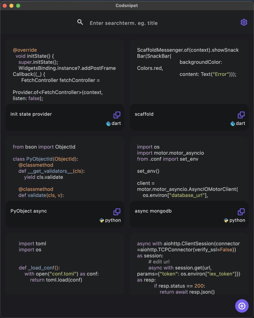 An application, to organize, label and search your code snippets. Safe time on your next project setup.
