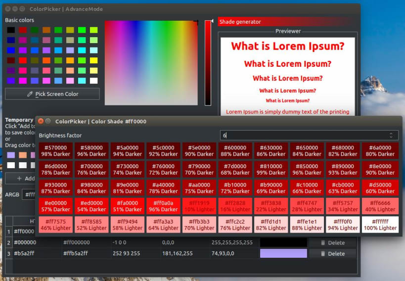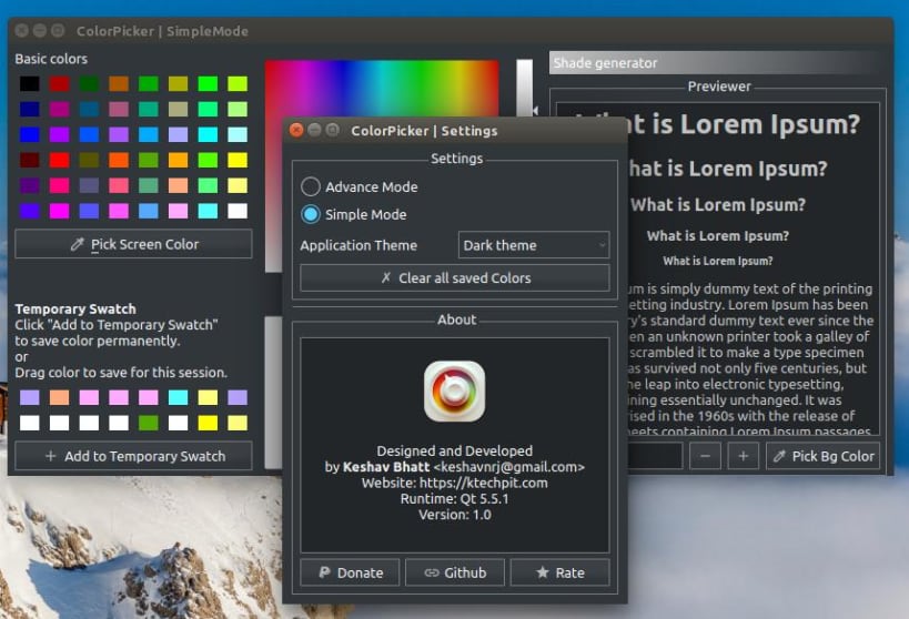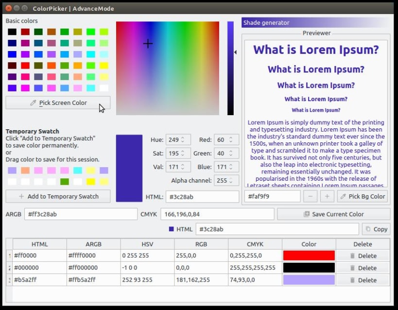 ColorPicker is an advance screen color picker based on Qt's QColorDialog library, A color picker and color editor for web designers and digital artists, created by a designer and digital artist. With Color Picker, identifying the colors, saving etc is quick and easy job.