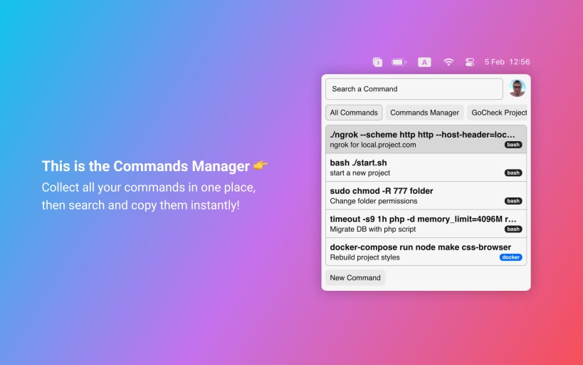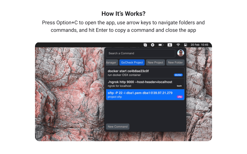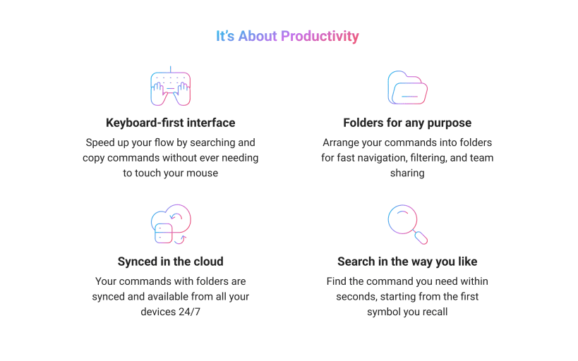 Keyboard-first interface. Speed up your flow by searching and copy commands without ever needing to touch your mouse