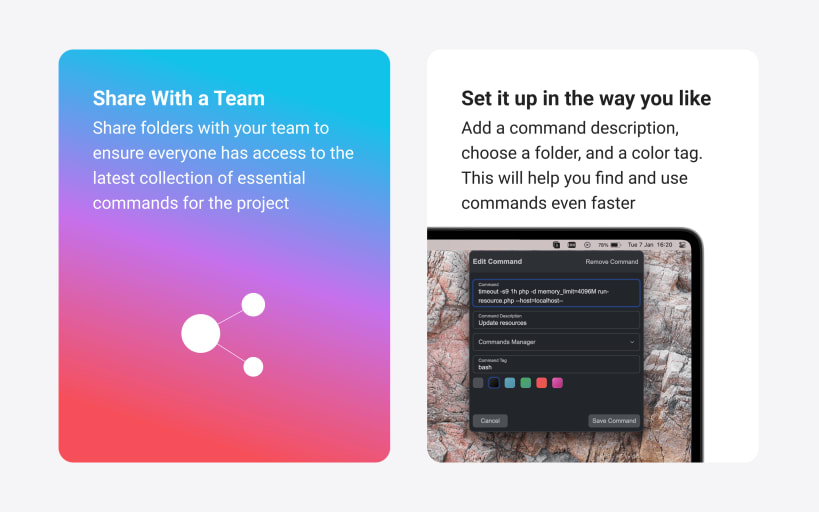 Share with a team. Share folders with your team to ensure everyone has access to the latest collection of essential commands for the project