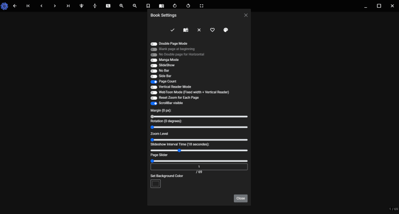 Zoom, Auto Background Color, Double page Mode, Blank first page, No double page for Horizontal, Manga Mode, Webtoon Mode, fullscreen, rotations, Bookmarks, Slideshow, SideBar, Hide Menu Bar.