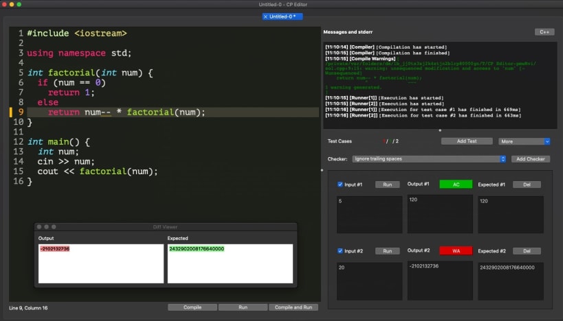 CP Editor is a Qt-based, lightweight and cross-platform code editor specially designed for competitive programming.