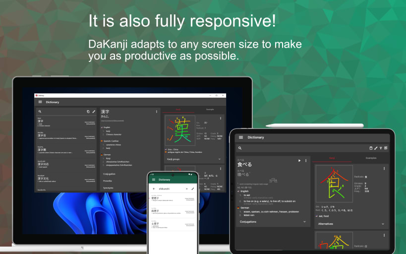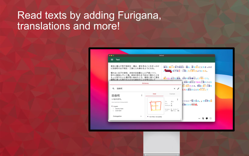Use the built-in dictionary to look up words in many languages, search Kanjis by simply drawing them, add furigana to texts, and much more!