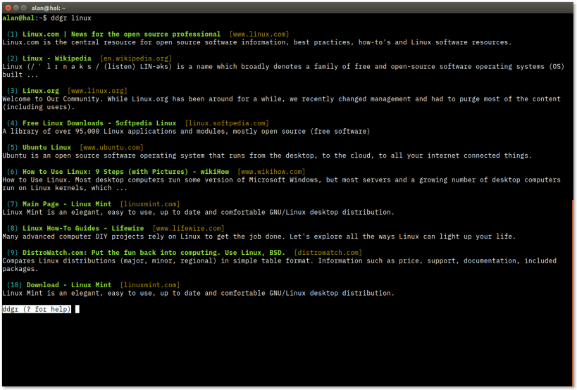 ddgr is a cmdline utility to search DuckDuckGo from the terminal. While googler is highly popular among cmdline users, in many forums the need of a similar utility for privacy-aware DuckDuckGo came up. DuckDuckGo Bangs are super-cool too! So here's ddgr for you! Unlike the web interface, you can specify the number of search results you would like to see per page. It's more convenient than skimming through 30-odd search results per page. The default interface is carefully designed to use minimum space without sacrificing readability. ddgr isn't affiliated to DuckDuckGo in any way..