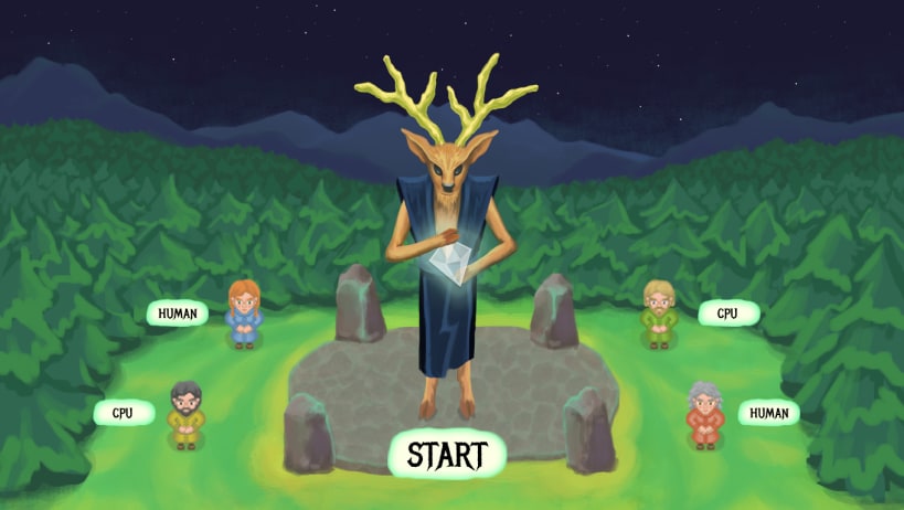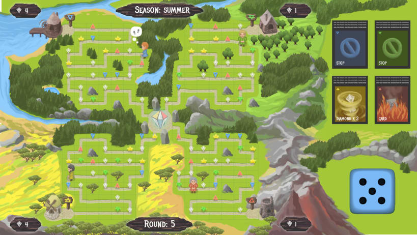 Deer Portal is a board game where you need to transfer yourself into the Deer God. To be allowed to pass the transformation you need to gift the Almighty Deer. The Almighty Deer likes shiny things, so collecting diamonds is a way to please him. A player who owns most diamonds on the Judgement Day - is a winner. The rest is being thrown into the flames of the infinitive, filled with collapsed realities folded in time void. Diamonds are being collected by moving the character onto the field containing a diamond, but also by grabbing a runes containing diamond action.