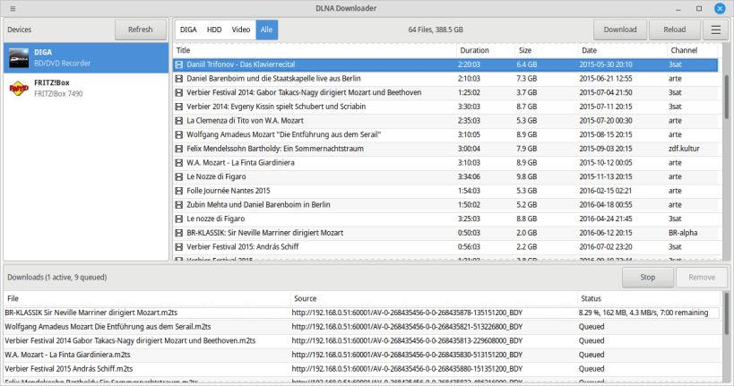 The DLNA Downloader provides an intuitive interface to browse and download media from DLNA-enabled devices such as HDD videorecorders or TVs. If supported by the device, the DLNA Downloader shows you not only the title, but also the size, duration, date and channel the program was recorded on.