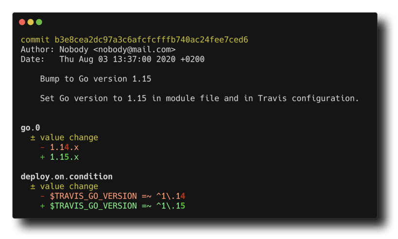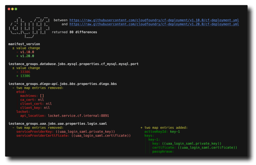 Each difference is referenced by its location in the YAML document by using either the Spruce or go-patch path syntax. The output report aims to be as compact as possible to give a clear and simple overview of the change.