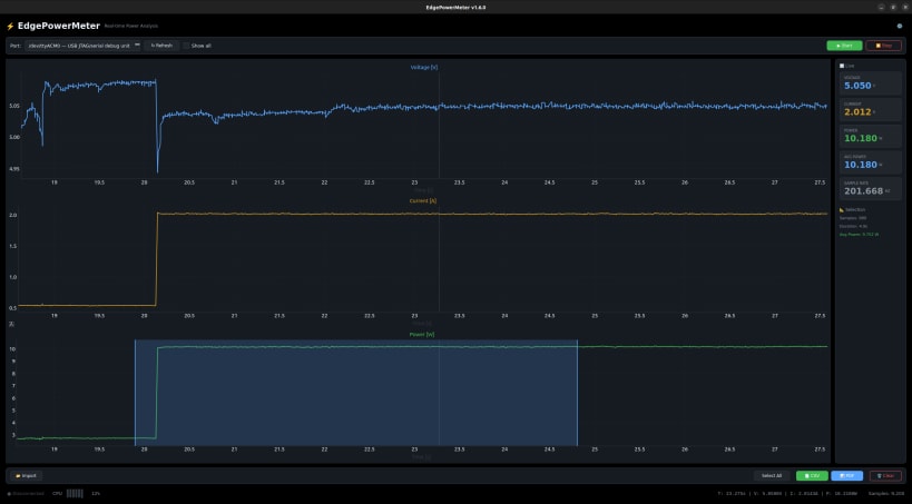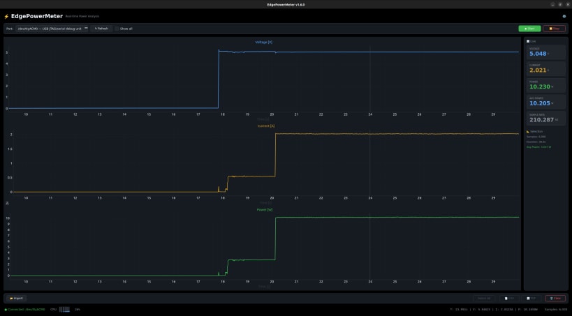 EdgePowerMeter is a complete power monitoring solution designed to measure voltage, current, and power consumption of embedded devices running AI inference workloads. Perfect for benchmarking FPS-per-Watt efficiency.