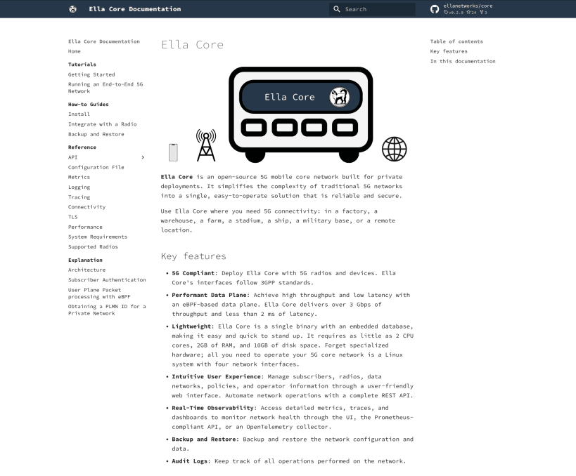 Ella Core is a 5G mobile core network designed for private deployments. It consolidates the complexity of traditional 5G networks into a single application, offering simplicity, reliability, and security.