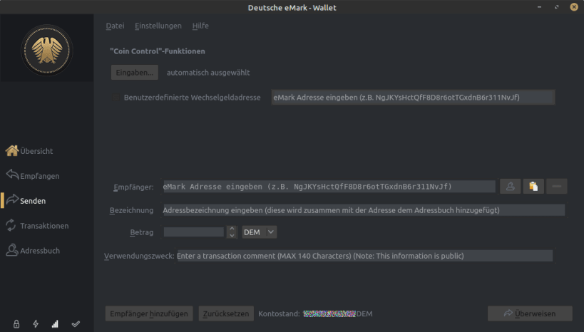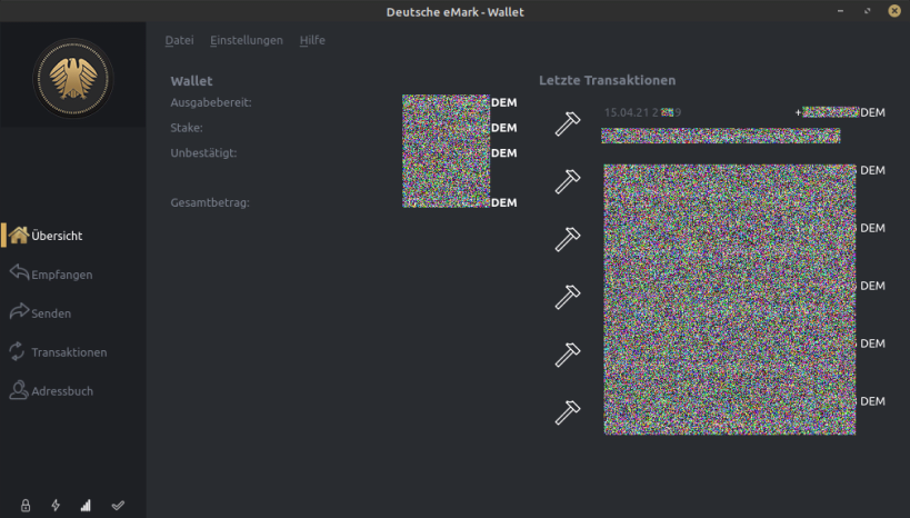 Als Wallet bezeichnet man die Software, welche benötigt wird um eMark zu transferieren. Die erste wäre der originale Software Client "eMark-qt". Diese lädt die komplette Blockchain (Kassenbuch) auf deinen Rechner und besitzt alle Funktionalitäten der eMark, inklusive der Zinserzeugung. Nachteilig ist der hohe Speicherplatzverbrauch, welcher Mai 2021 schon ~2 GB beträgt, da alle durchgeführten Transaktionen inkl. Verwendungszweck für immer in der Blockchain gespeichert sind. Nutzer des eMark-qt Wallets unterstützen das eMark Netzwerk.