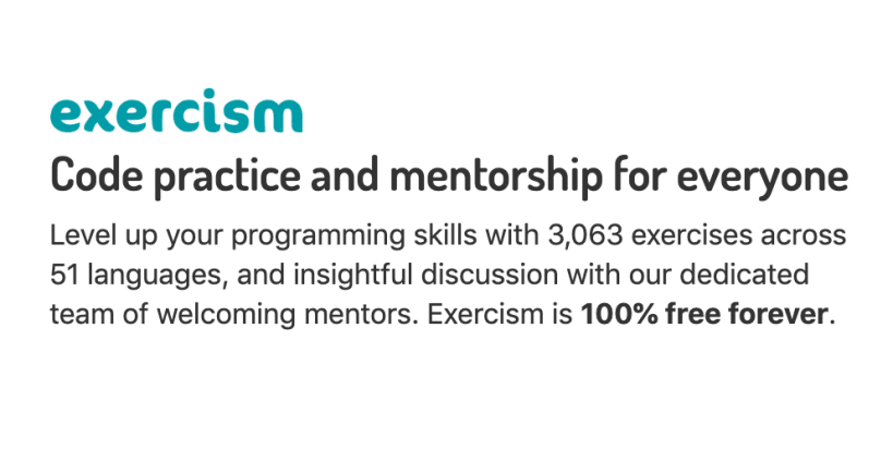Exercism is an online platform designed to help you improve your coding skills through practice and mentorship.