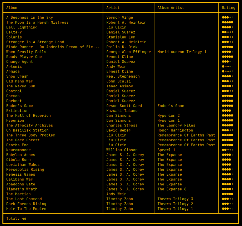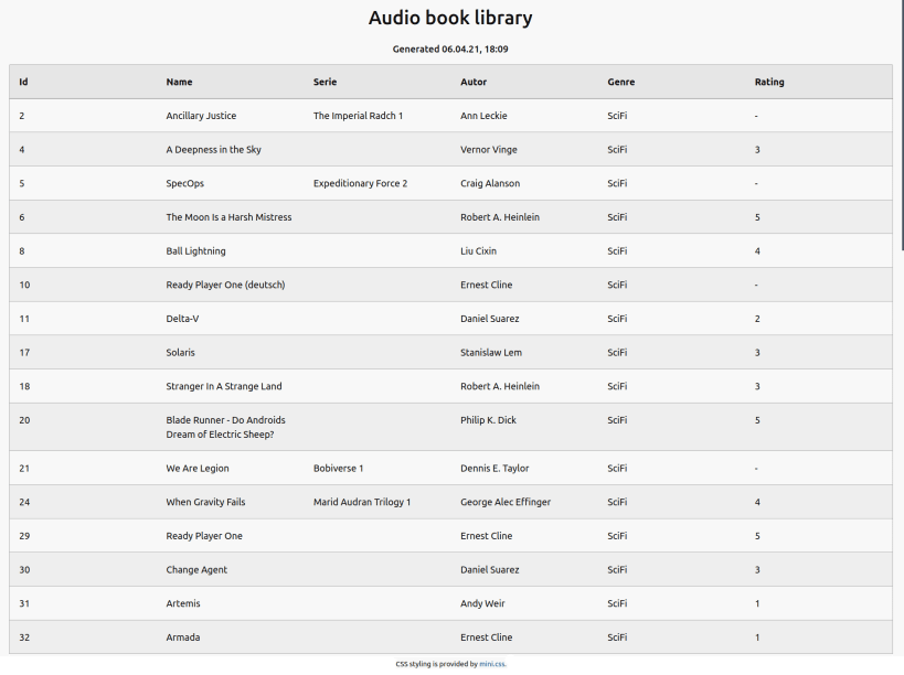 Use this tool to manage your audiobook library from the line. You can can add/list/rate books and mark them as completed. The library can be exported in a cli friendly format as well as html. Library entries can easily be updated an metadata may be written back to the files.