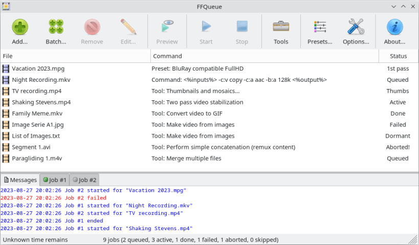FFQueue is (yet another) graphical user interface for FFmpeg with comprehensive support for both the basic features but also the more advanced features like filtergraphs. FFQueue makes it easy to create multiple jobs and process them as a single queue.