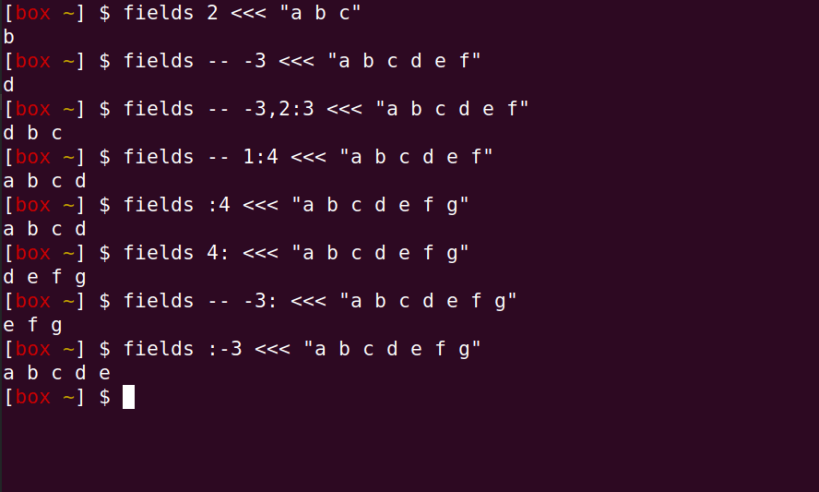 fields is a tool for selecting columns of text. One or more individual columns and/or ranges of columns can be selected by index. Indexes can be positive (counting from the left) or negative (counting from the right). Ranges can bounded or unbounded (e.g. select all input to the left or right of N).