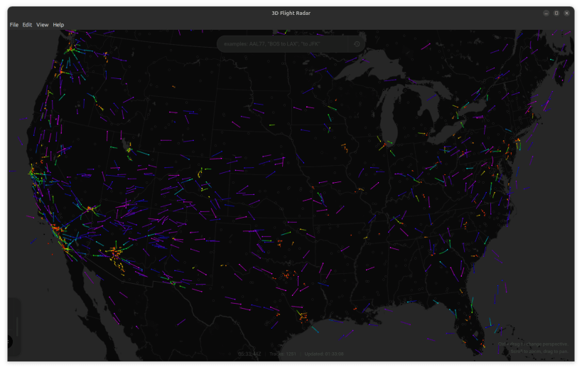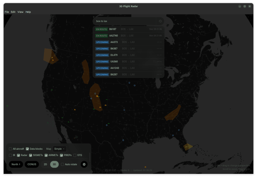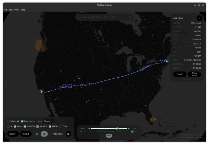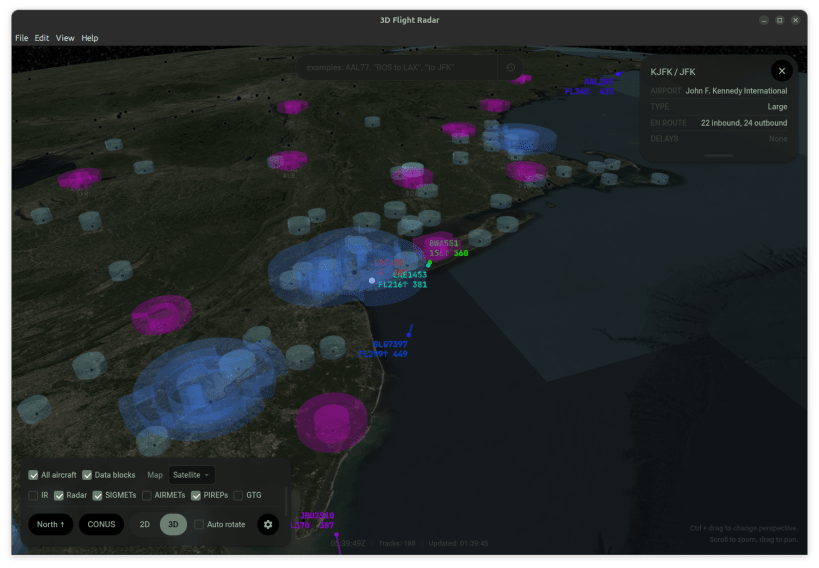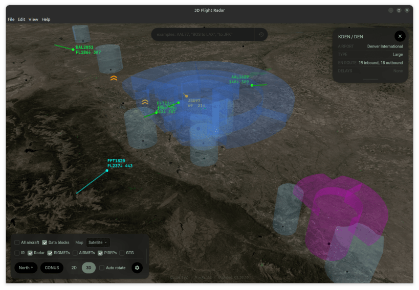 Flight Radar renders OpenSky Network aircraft data and NOAA weather in a 3D global display. It will work "out of the box", using anonymous OpenSky Network access, but to get full use out of it you will need to provide API credentials for OpenSky (free) and alternatively FlightAware (paid). You will need FlightAware to do searches for flights or see the filed route of a flight.