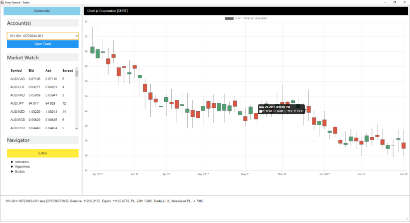 ## Planned Features Integration with https://www.npmjs.com/package/@pingleware/metatrader4-oanda to provide MT4-like interfacing for algorithmic trading and indicator attachments. Cordova-build for mobile distribution to be the first mobile trading application that includes algorithmic trading. Multiple concurrent account trading-the current version of MT4/MT5 only permits one account active trading at a time.