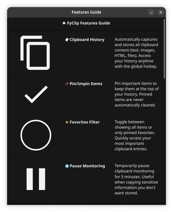 - ๐ Clipboard History: Automatically saves text, images, HTML, and files