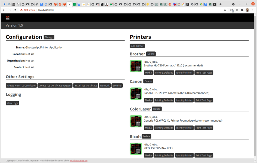 This Printer Application emulates a driverless IPP network printer (IPP Everywhere) for each physical printer set up with it, so your computer's printing environment discovers it automatically and makes your printer(s) available for printing. Like on a physical network printer there is a web interface for administration, here especially also for adding and configuring printers. You find it with your browser under https://localhost:8000/