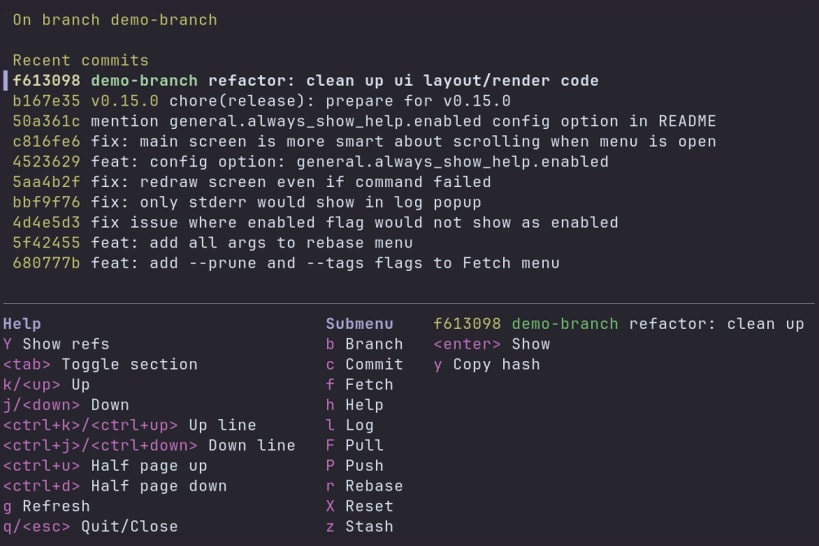 Gitu aims to implement many of the core features of Magit over time. It should be familiar to any previous Magit users.
