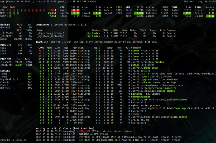 Glances is a cross-platform monitoring tool which aims to present a maximum of information in a minimum of space through a curses or Web based interface. It can adapt dynamically the displayed information depending on the user interface size.