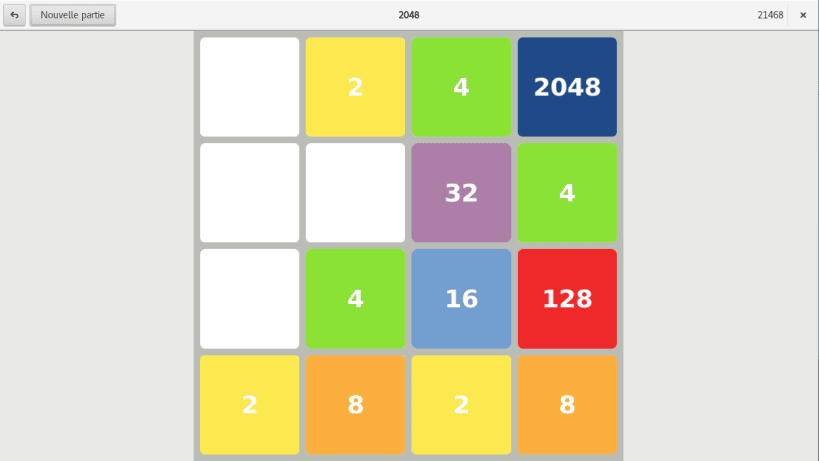 Play the highly addictive 2048 game. GNOME 2048 is a clone of the popular single-player puzzle game. Gameplay consists of joining numbers in a grid and obtain the 2048 tile.