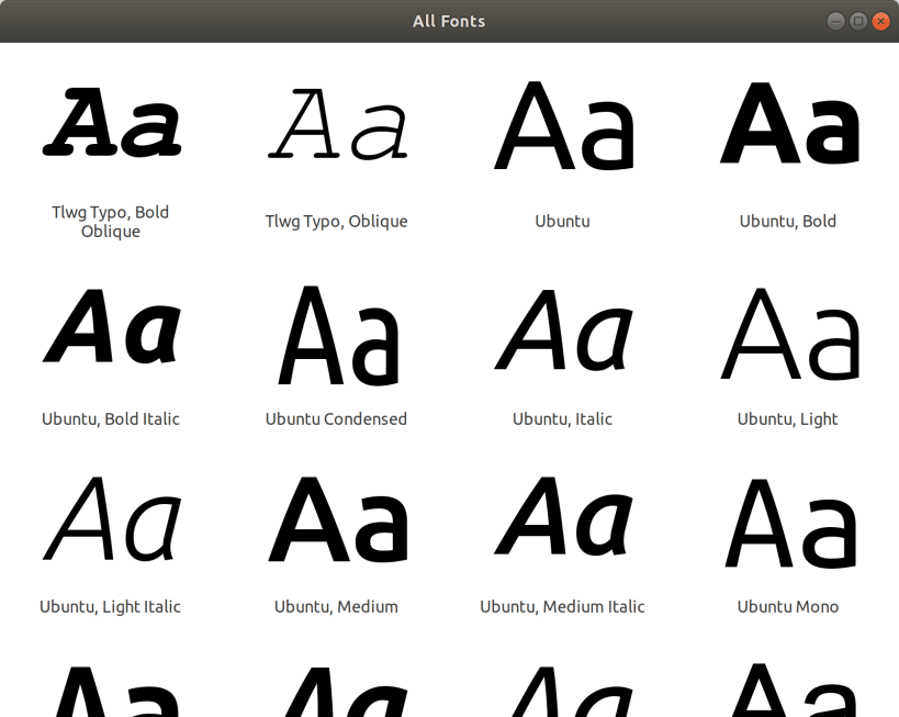 GNOME Fonts shows you the fonts installed on your computer for your use as thumbnails. Selecting any thumbnails shows the full view of how the font would look under various sizes.