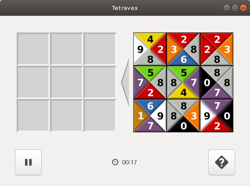 Each square piece has a number on each side. Position the pieces on the left side of the board so that the same numbers are next to each other. If the numbers don't match, you can't put the piece there. Move quickly: you're being timed!