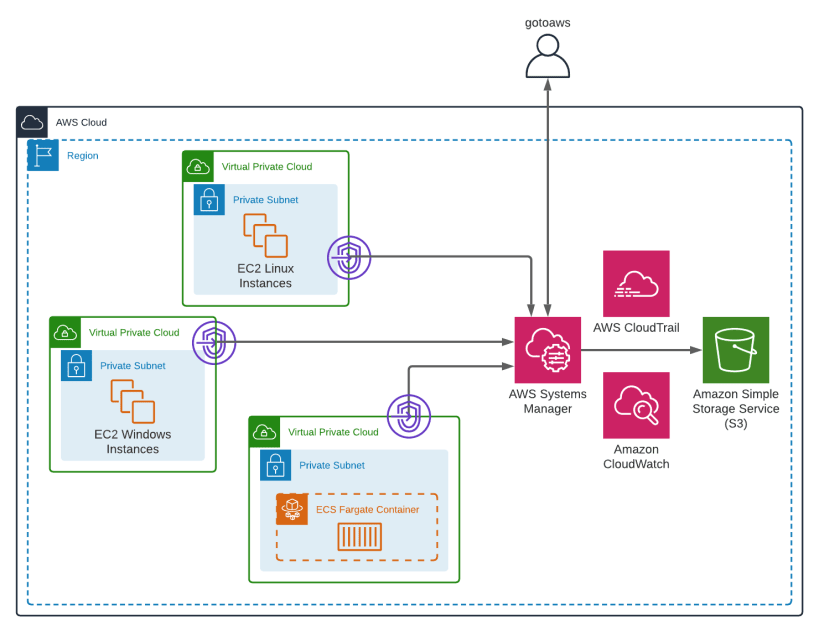 gotoaws is an interactive CLI tool that you can use to connect to your AWS resources (EC2, ECS container) using the AWS Systems Manager Session Manager. It provides secure and auditable resource management without the need to open inbound ports, maintain bastion hosts, or manage SSH keys.