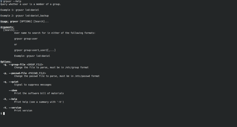 Use grpusr to query which group (or groups) a user (or users) is a member of! No more nasty shellscript parsing of /etc/group and /etc/passwd! I've done it for you!