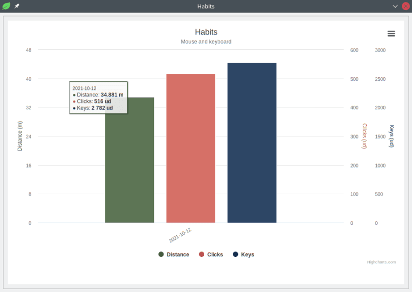 habits monitors how far you move your mouse, how many mouse clicks you make, and how many keyboard button presses you make. It stores this information on a day to day basis and allows you to see historical trends of this absolutely crucial and necessary data.