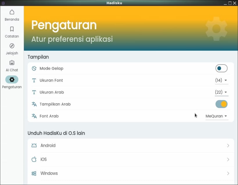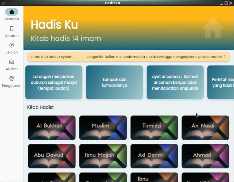 HadisKu is a multi-platform Islamic application that unifies authentic Hadith collections from 14 renowned Imams in one place, making it easy to study, reference, and share Hadith wherever you are.